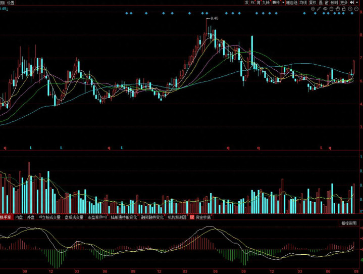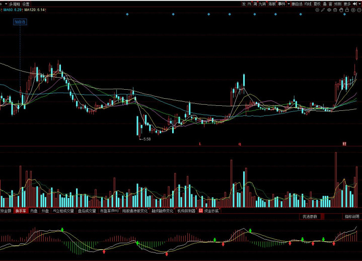 招商轮船的强势阳线放量上涨收于前反弹高点附近,此后形成高位两个交易日的小阳线,股价在上行5日线支撑的下的二次冲高后,股价出现回调并下破5周线,上行10周线支撑下冲高在前高点受阻并形成两根十字星震荡后,在该股形成强势拉升,5 10日线形成上涨通道,股价强势拉升。对比前一波的强势上涨,经过次日的高开后,招商轮船形成小阳线上涨后,次日再次高开回落,经过3个交易日的上涨后,股价的回落在5日线的支撑下形成两根十字星震荡后,招商轮船大幅高开低走,此处该股并没有在5 10日线的位置形成支撑,该股低开在20 30日线的位置形成支撑,招商轮船在粘合均线的位置形成横向震荡后五八策略,形成目前的强势拉升走势。