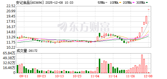 安记食品盘中涨停,已连收5个涨停板,截至9:25,该股报21.42元,换手率0.39%,成交量90.88万股,成交金额1946.56万元,涨停板封单金额为2.35亿元。连续涨停期间,该股累计上涨61.05%,累计换手率为68.28%。最新A股总市值达50.38亿元。